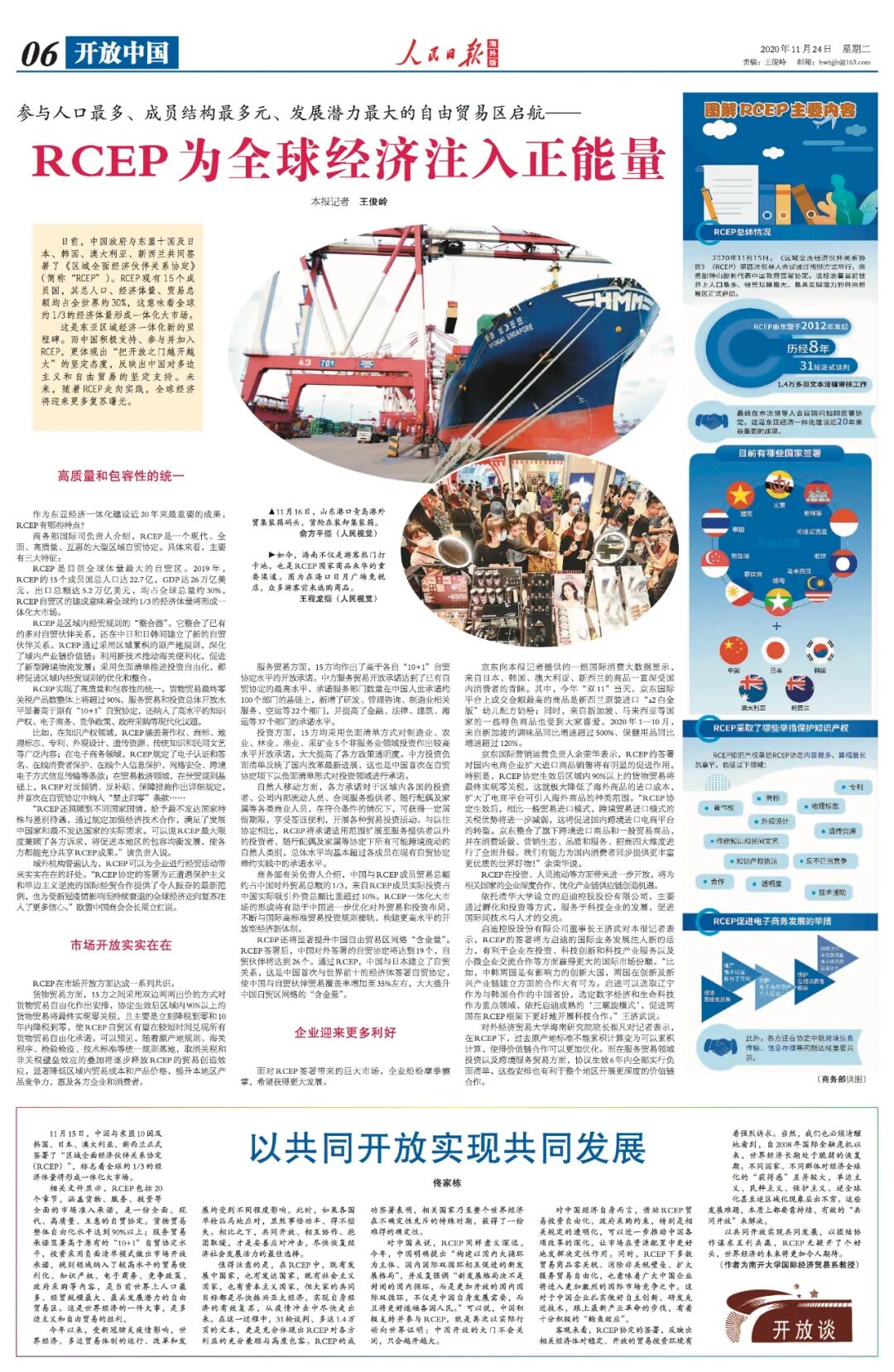 日前,中国政府与东盟十国及日本、韩国、澳大利亚、新西兰共同签署了《区域全面经济伙伴关系协定》(简称“RCEP”)。11月24日,人民日报海外版以《RCEP为全球经济注入正能量》为题对此进行了专题报道。