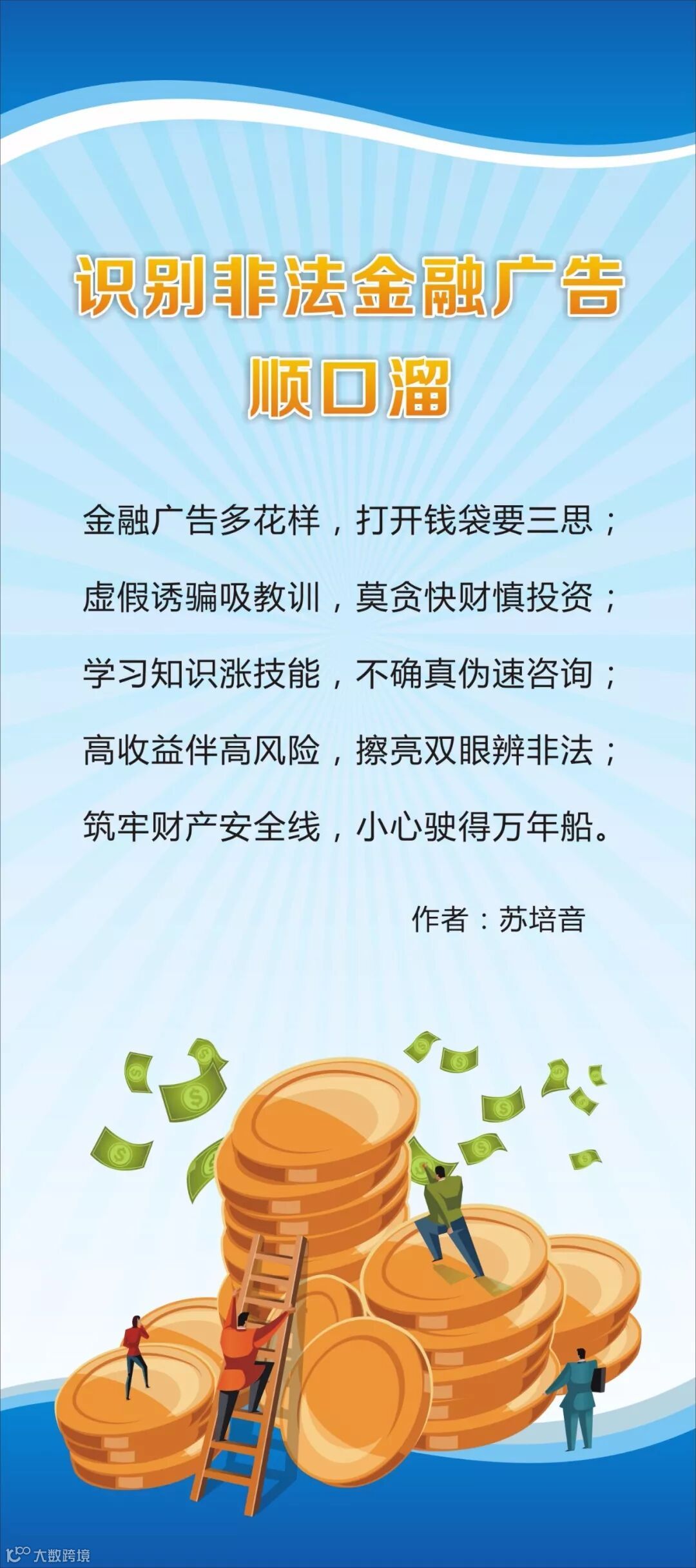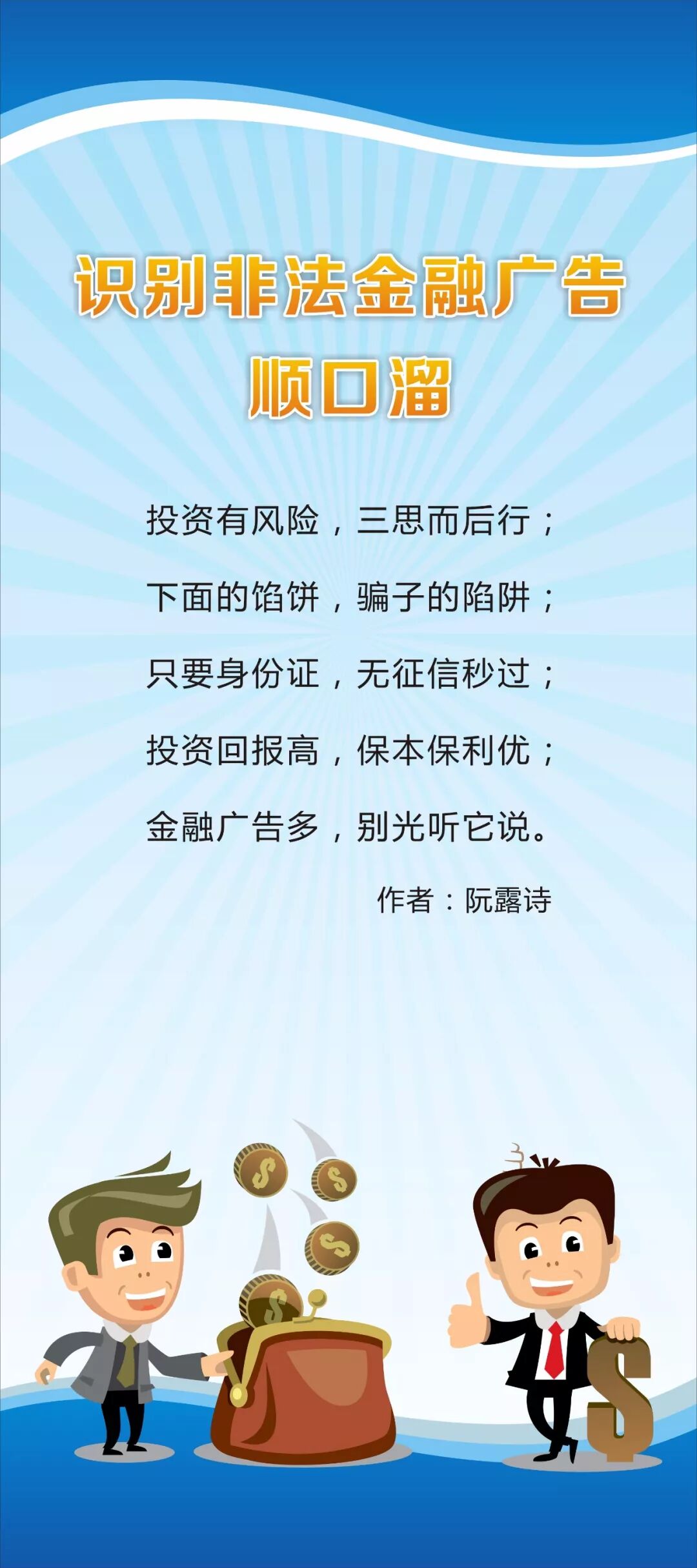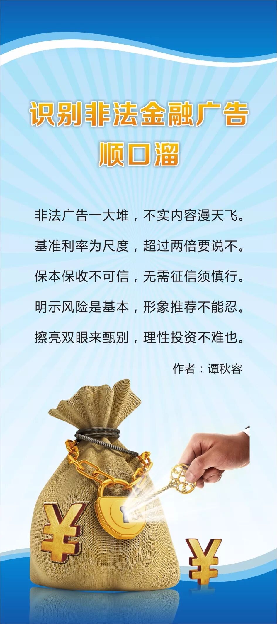 为了帮助大家快速简单地掌握识别非法金融广告的常识,人民银行茂名市中心支行、茂名市金融消费权益保护联合会组织开展了识别非法金融广告顺口溜创作征集活动。现公布部分优秀原创作品,您在欣赏之余记得记下几条哟!守好“钱袋子”,安心过日子。