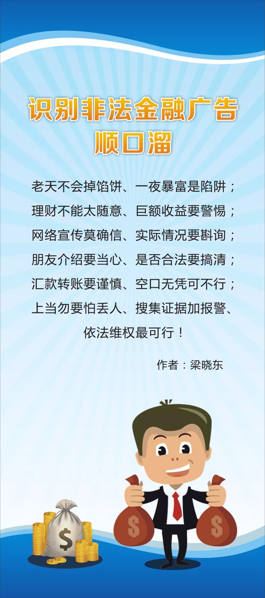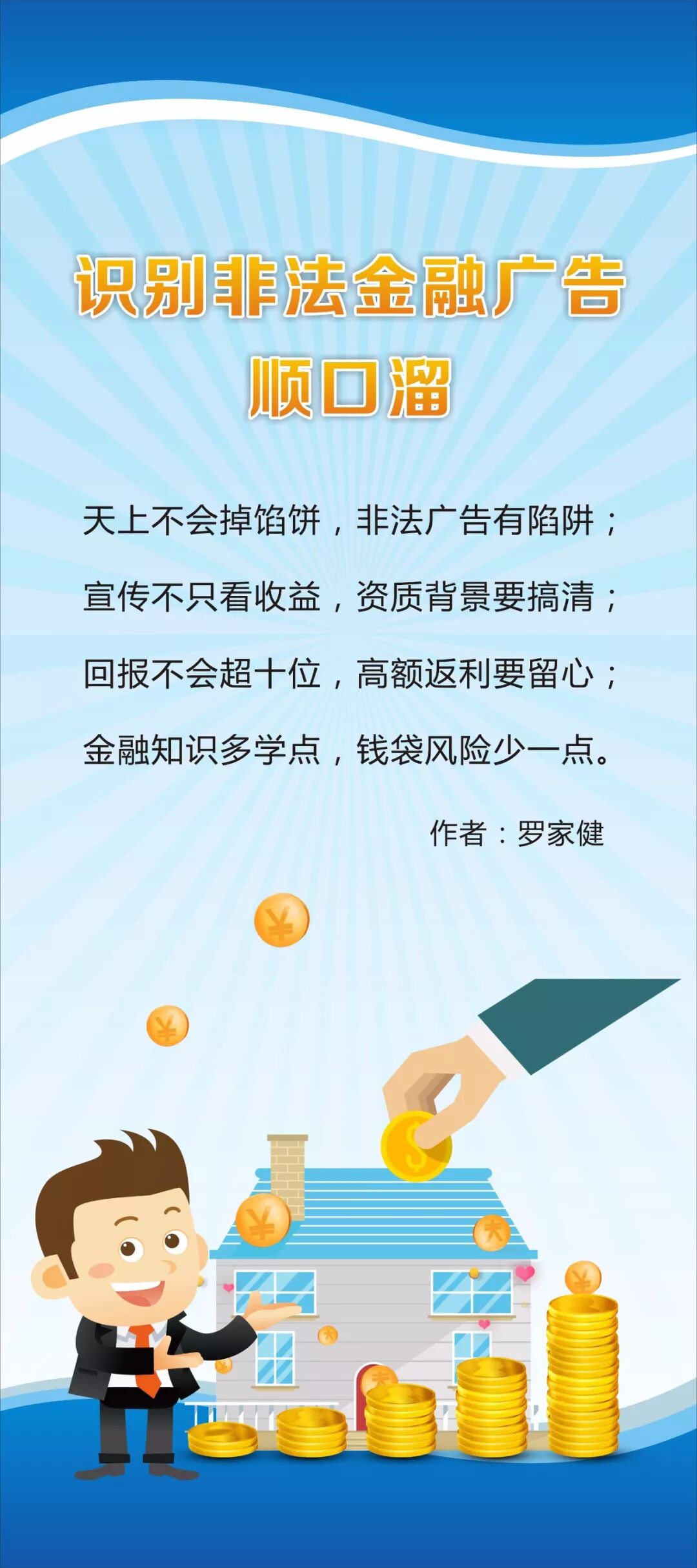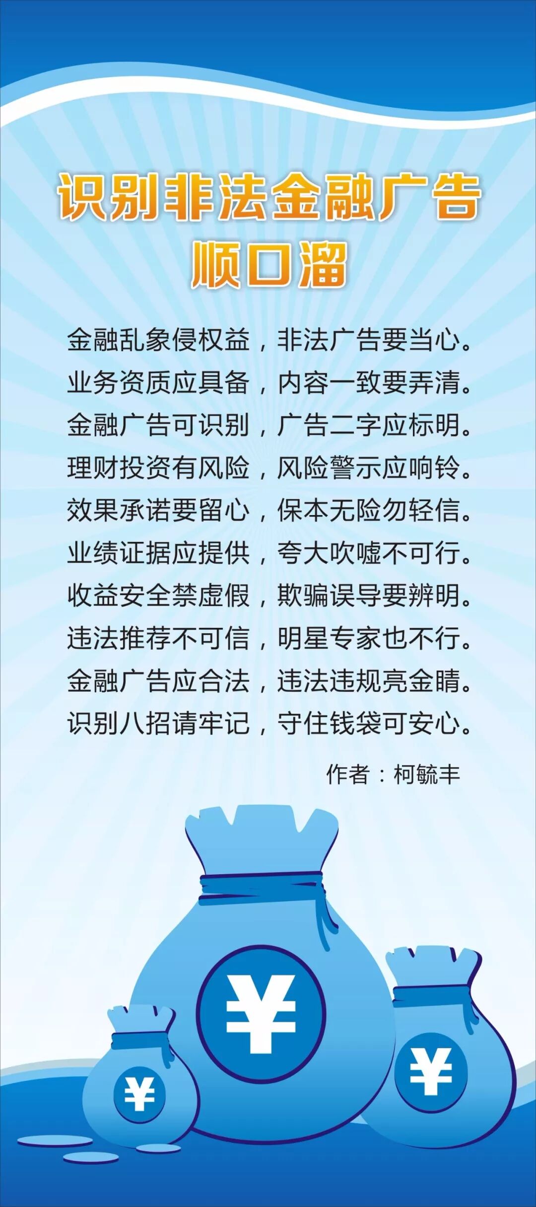 为了帮助大家快速简单地掌握识别非法金融广告的常识,人民银行茂名市中心支行、茂名市金融消费权益保护联合会组织开展了识别非法金融广告顺口溜创作征集活动。现公布部分优秀原创作品,您在欣赏之余记得记下几条哟!守好“钱袋子”,安心过日子。