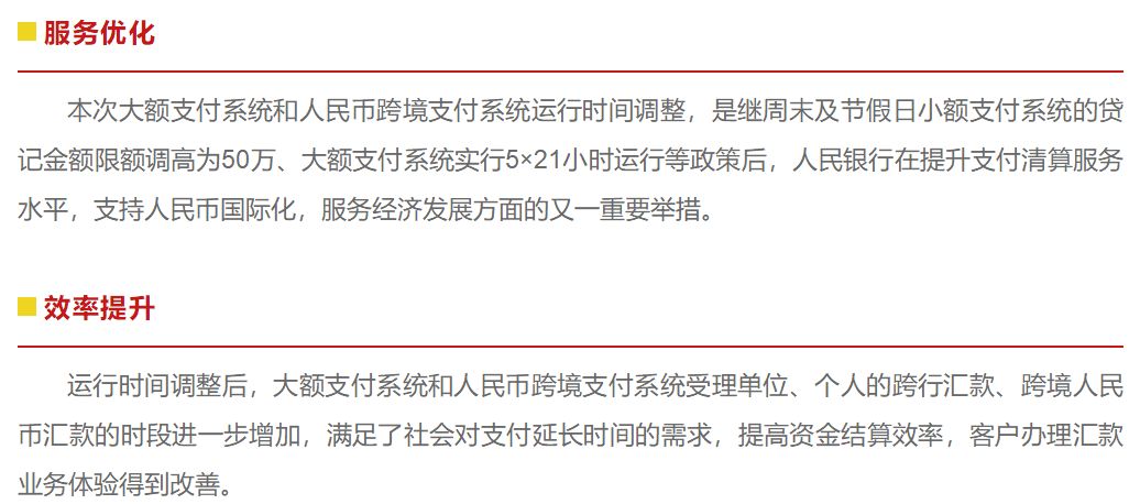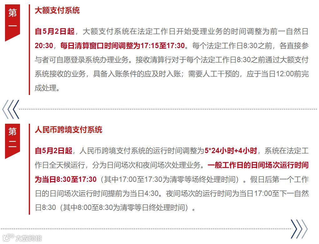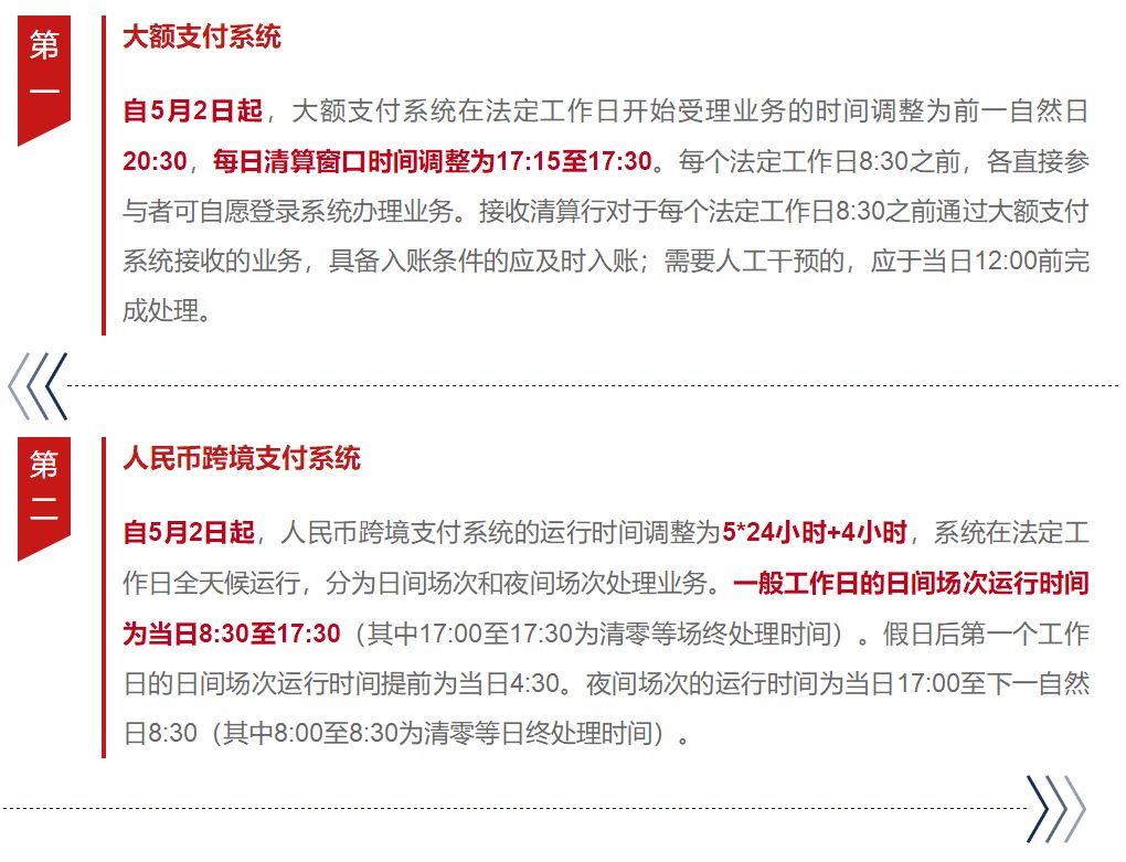 为进一步支持人民币国际化,人民银行决定自2018年5月2日起,调整大额支付系统和人民币跨境支付系统(CIPS)运行时间,并对银行类直接参与者、金融市场基础设施类直接参与者登陆系统、处理业务的时间做出了详细的安排。