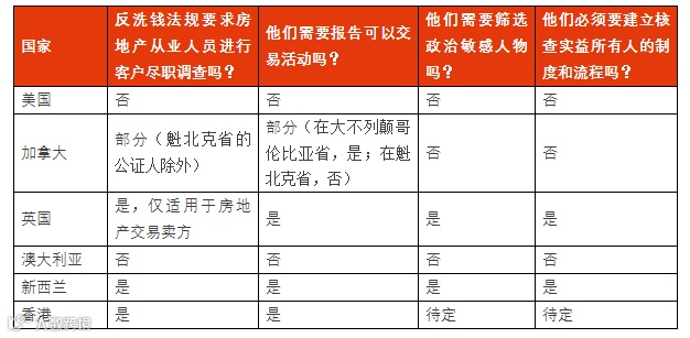 经济合作与发展组织(OECD)2014年发布的一份报告显示,在其成员国中,44%的国家的房地产经纪人和代理人不需要对买方进行尽职调查。透明国际(TransparencyInternational)最近在英国、美国、加拿大和澳大利亚的房地产领域开展了一项名为“门户大开”的调查,该报告强调了一些阻碍打击犯罪活动的问题。调查发现: