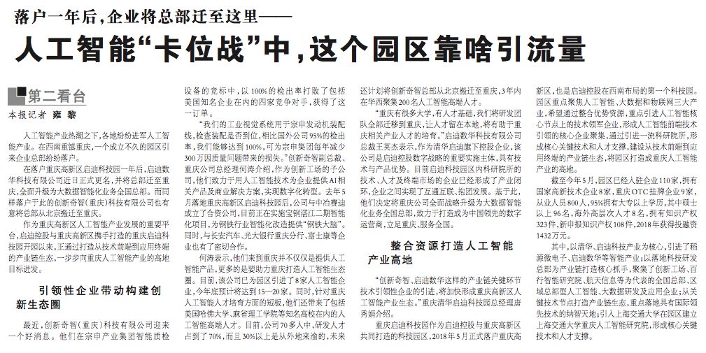 “创新奇智、启迪数华这样的产业链关键环节技术引领性企业的引进,将加快形成重庆高新区人工智能产业生态。”重庆清华启迪科技园总经理唐秀娟介绍。