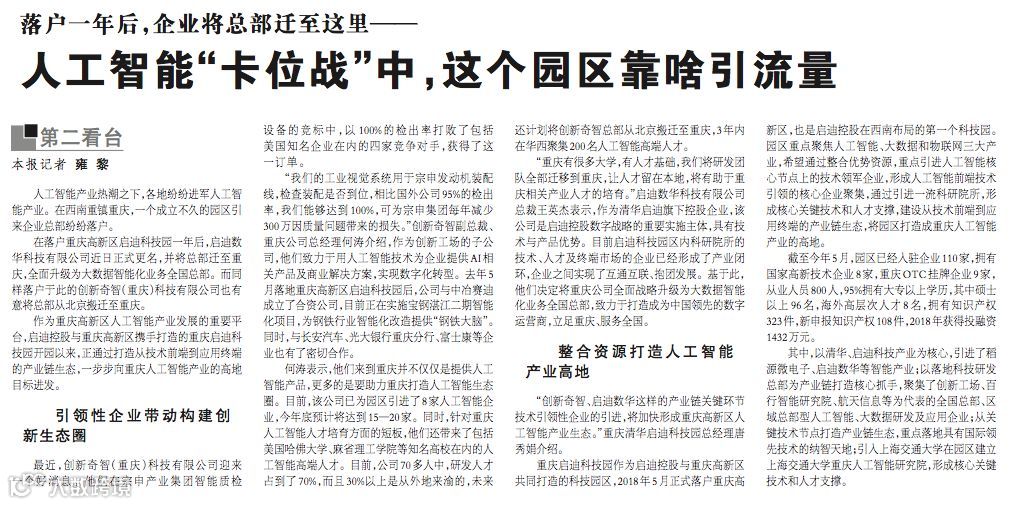 作为重庆高新区人工智能产业发展的重要平台,启迪控股与重庆高新区携手打造的重庆启迪科技园开园以来,正通过打造从技术前端到应用终端的产业链生态,一步步向重庆人工智能产业的高地目标进发。