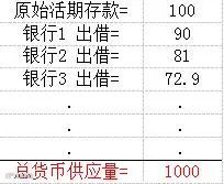 以此类推下去,如果每个银行都这样做的话,整个体系中因为这银行1中的100元的原始存款导致最终总货币供应量的变化就是: