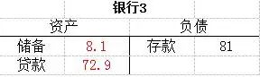 而拿到81元贷款的那个人,只要他不是喜欢收集贷款并且享受支付利息的快感的变态,他一样会把这81元贷款花出去(不管他是消费还是投资)。如果这81元被他用于投资朋友的便利店,便利店接过这81元,把这81存入便利店在银行3开设的银行账户。这就跟前面的故事一样,此时银行3的R=10%,他又会借出72.9元,于是银行3的B/S看起来就是: