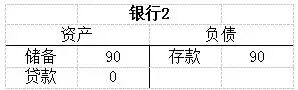 为了简化,假如拿到贷款的人用这90元请了一个钟点工,钟点工将这90元存入他的在银行2开设的银行账户。此时此刻银行2的资产负债表就是: