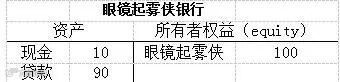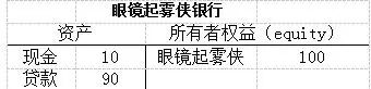假如我想创办一个借贷银行,我拿出100元现金,我借给贷款人90元,那么货币供应量会怎么样呢?我们来看看资产负债表: