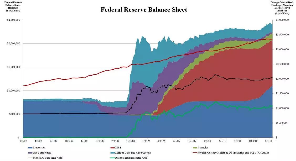 1.通过在银行那里购买美国政府国债记入自己的资产负债表,美联储把钱付到银行的储备金账户。有了更多储备金,银行就可以贷出更多的款,于是就增加了货币供给。