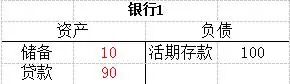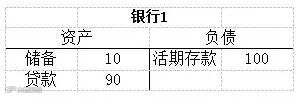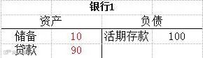 在部分准备金制度的现实中,当我们将100元钱存入银行1的时候,在银行1的资产负债表上,我们的100元存款被记为银行的负债。随后如果银行再根据央行规定的10%存款准备金率(记为R),将90元贷款借出去,这90元贷款就出现在银行1的资产中,同时还有银行留下来的10元作为储备。