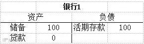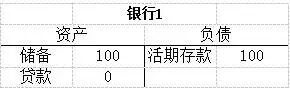 公众将100元钞票存入银行1,并且银行1将这100元完全作为自己的储备。这种储蓄银行事实上在17世纪是非常成功的(Bank of Amsterdam)。现在我们来看一下在会计上这种制度会以什么样的形式存在: