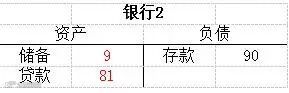 而如果银行2和银行1一样,R =10%,银行2又选择将所有可以贷的都贷出去,于是银行2的b/s就会变成: