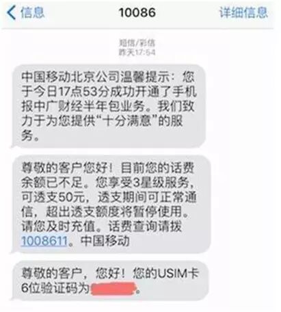 近日某市徐小姐收到中国移动发来的短信,提示成功订购某财经业务,40元/半年,同时还收到一条中国移动“10086”发来的“USIM卡6位验证码”。