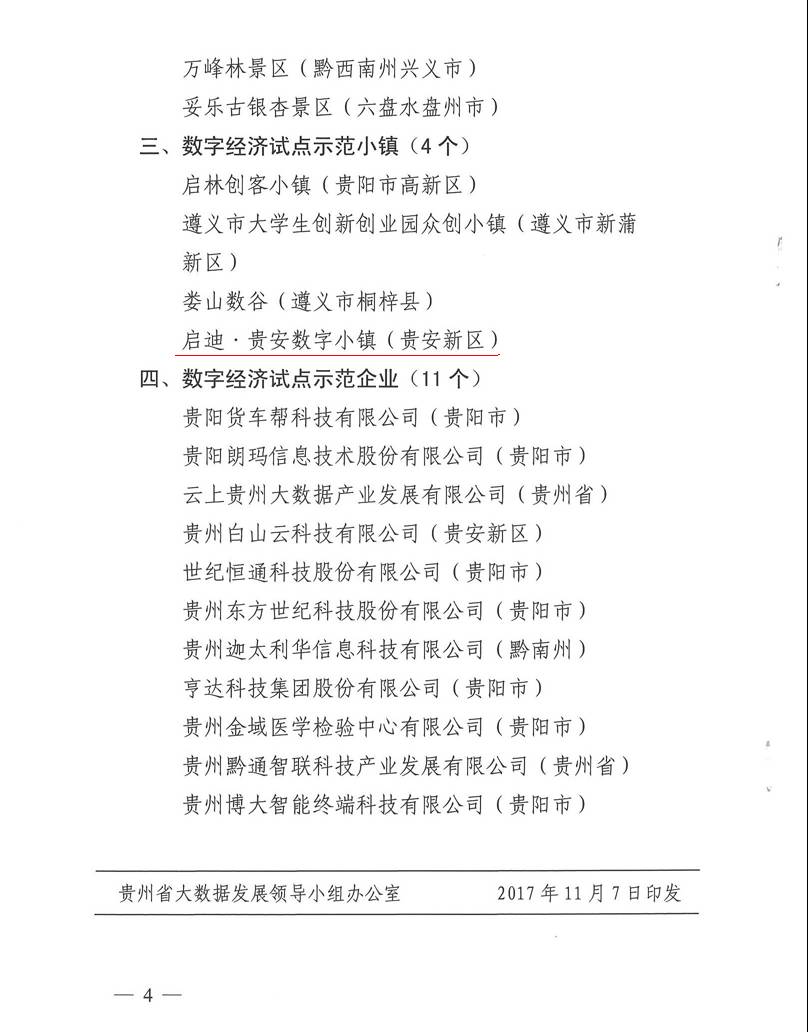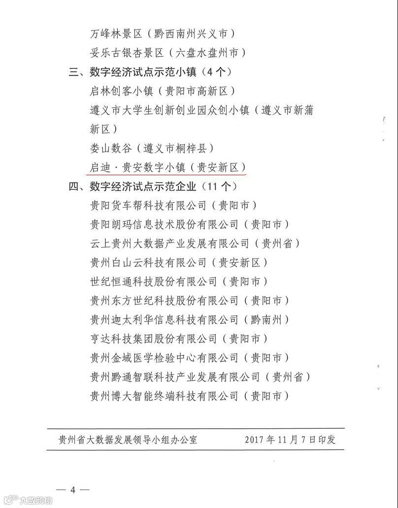 近日,贵州省大数据发展管理局正式公布贵州省2017年第二批数字经济试点示范单位名单。在本次评选中,启迪贵安数字小镇获得“贵州省2017年第二批数字经济试点示范单位”荣誉称号。