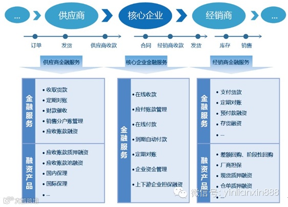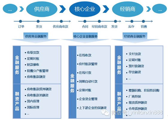 供应链金融业务不仅为核心企业的上下游企业提供融资服务,还提供了账款催收、对账、支付结算等与企业交易过程相关的其他金融服务,并且为核心企业提供了账款管理、支付结算、企业资金管理等金融服务。该平台涵盖了贸易过程中预付类、存货类、应收类等20多个典型的金融产品,并且支持跨贸易阶段的全流程管理,有效的将银行、核心企业、上下游企业、物流企业联系在一起。