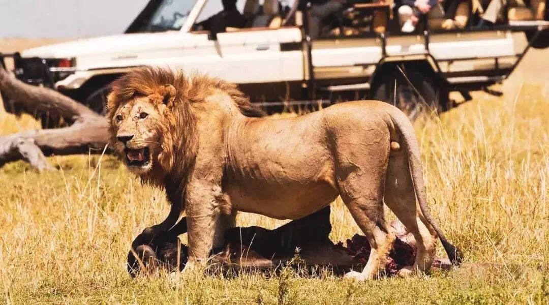 长颈鹿伴着越野车奔跑,斑马慢悠悠地过马路,狮子旁若无人地在草原用餐。