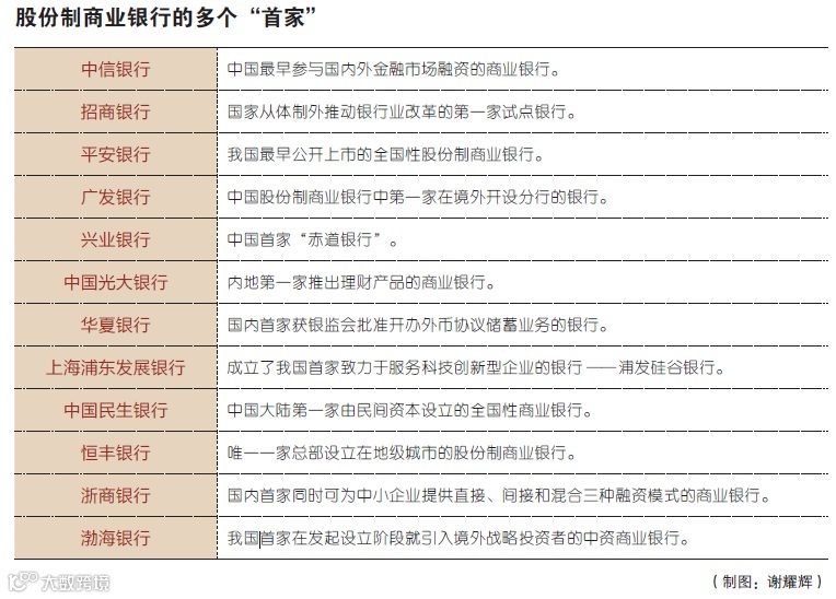 “作为我国金融体制改革深化和金融领域逐步市场化的产物,股份制商业银行从诞生之初,在股权结构、治理机制、经营管理等方面就曾有诸多突破和创新,在银行业改革大潮中,多次扮演‘试验田’的角色,在很多领域成功地激发整个银行业的市场活力。”