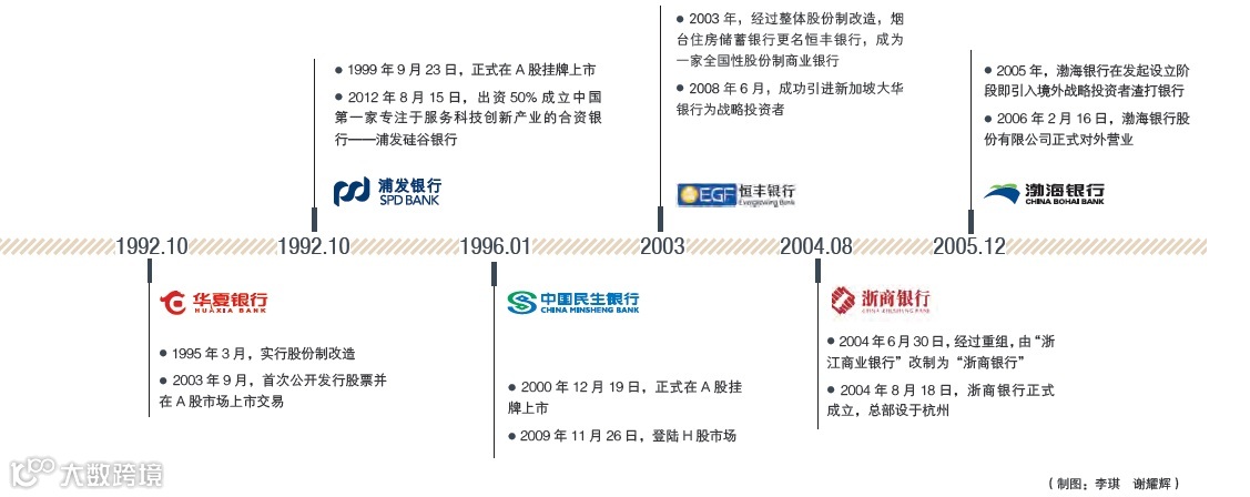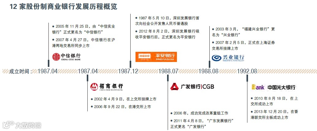 1987年4月,在我国改革开放的发源地 —— 深圳特区,招商银行正式对外营业。随后的两年时间,中信实业银行(2005年更名为中信银行)、深圳发展银行(2012年更名为平安银行)、福建兴业银行(2003年更名为兴业银行)、广东发展银行(2011年更名为广发银行)陆续成立。