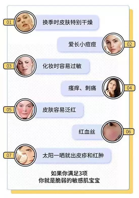 任何肤质中都可能有敏感肌。众所周知,敏感性皮肤通常表皮层较薄,自我保护能力差,容易出现干燥、皱纹、脱皮、毛细血管明显等症状。在外界环境变化的时候,敏感性肌肤比较容易干燥,伴随有刺痛、燃烧感,易红肿发痒,皮肤较脆弱,缺乏弹性等......