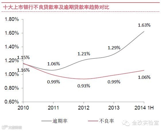 2014年上半年十大银行的不良贷款余额达5197.60亿元,较2013年末增长705.98亿元,增幅15.71%,已接近2013年全年增幅(732.27亿元)。不良贷款率也较2013年末上升0.07个百分点至1.06%。十家银行的不良率全部有所上升。逾期率较2013年末上升了0.34个百分点至1.63%,升幅高于不良率。