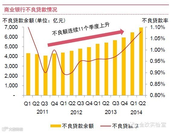 从普华永道统计的数据来看,截至2014年6月末商业银行不良贷款余额6944亿元,自2011年四季度起连续11个季度增加;不良贷款率1.08%,也是2011年一季度后的新高。