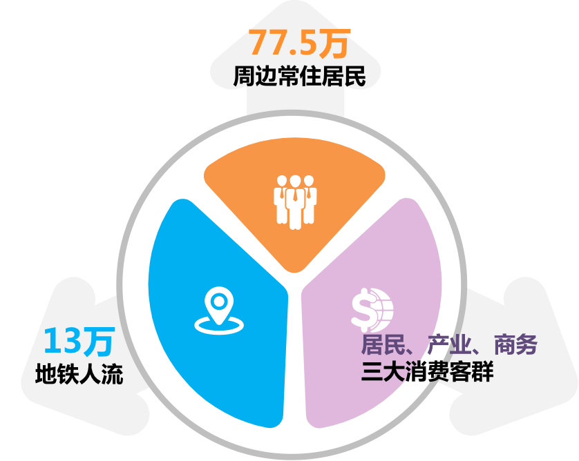 项目周边除住宅小区云集外,拥有大量奉贤产业集群,以及商务办公中心,未来将激发庞大的年轻群体消费潜力,带来居民、产业、商务三大实力消费客群。