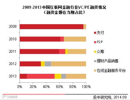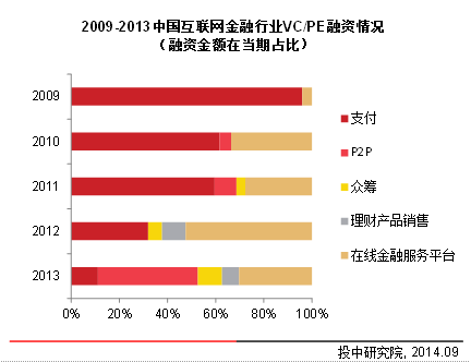 图1 2009-2013中国互联网金融行业VC/PE融资情况(融资金额在当期占比)