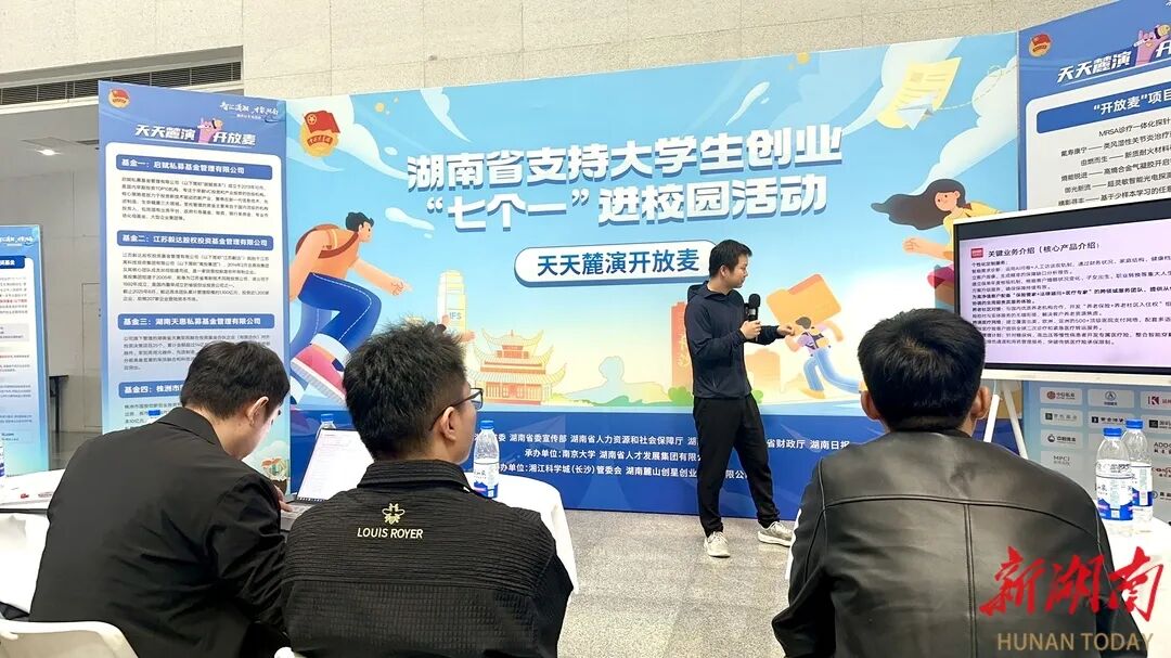 这里正在举行的,是“智汇潇湘·才聚湖南”创业政策宣介会暨湖南省支持大学生创业“七个一”进校园活动,活动以投资洽谈、政策推介、项目路演、创业分享为纽带,向江苏高校学子递出“来湘创业”的橄榄枝。