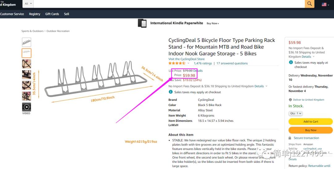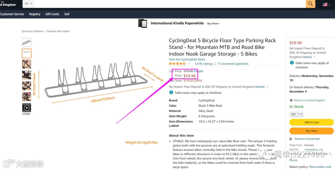 利 润:净利润=售价-进价-物流费-亚马逊抽佣=383.16-72.80-65-57.47=187.89元