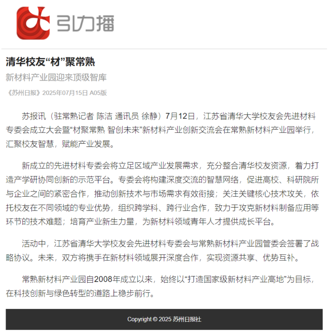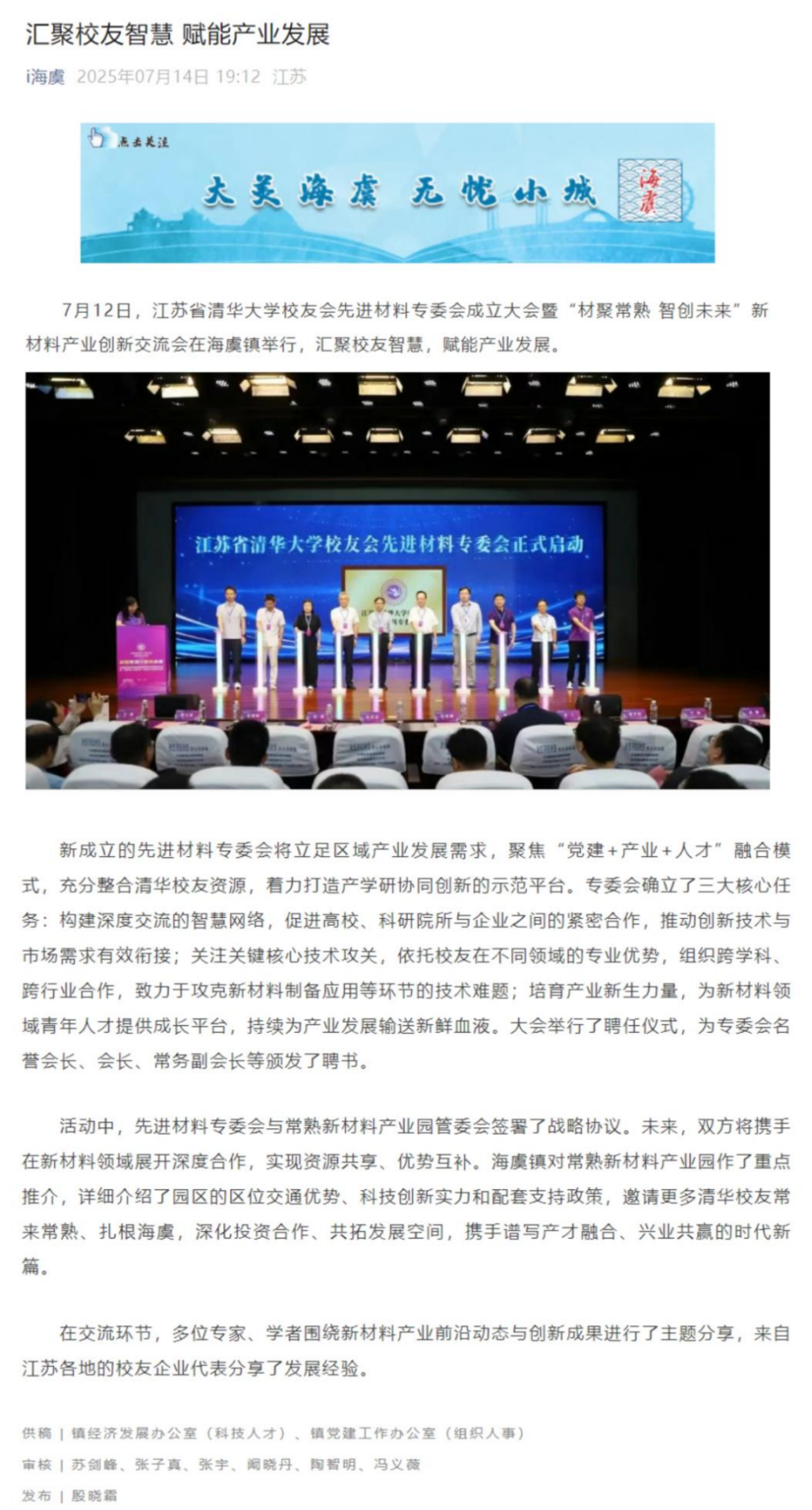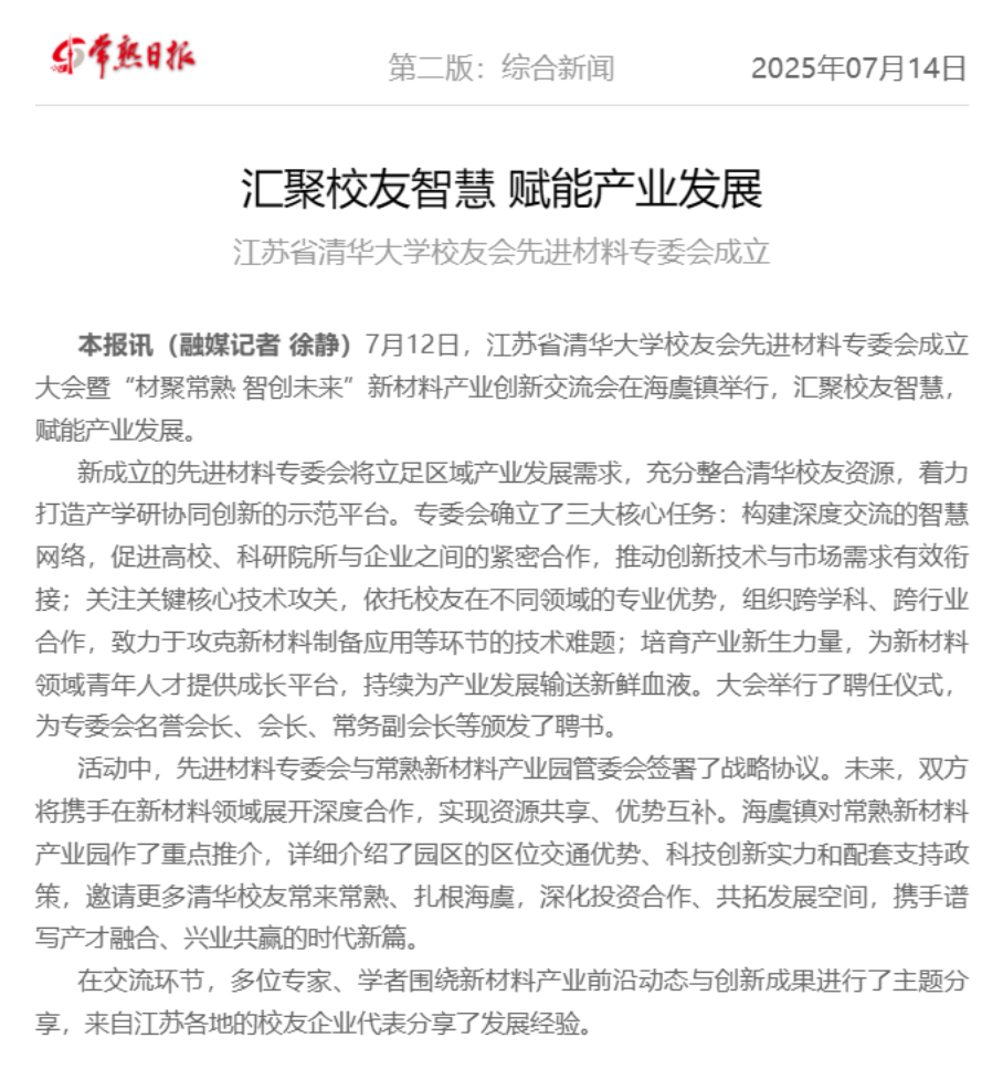 7月12日,江苏省清华大学校友会先进材料专委会成立大会暨“材聚常熟智创未来”新材料产业创新交流会在常熟海虞镇举办,获新华网、苏州日报、常熟日报等主流媒体报道。