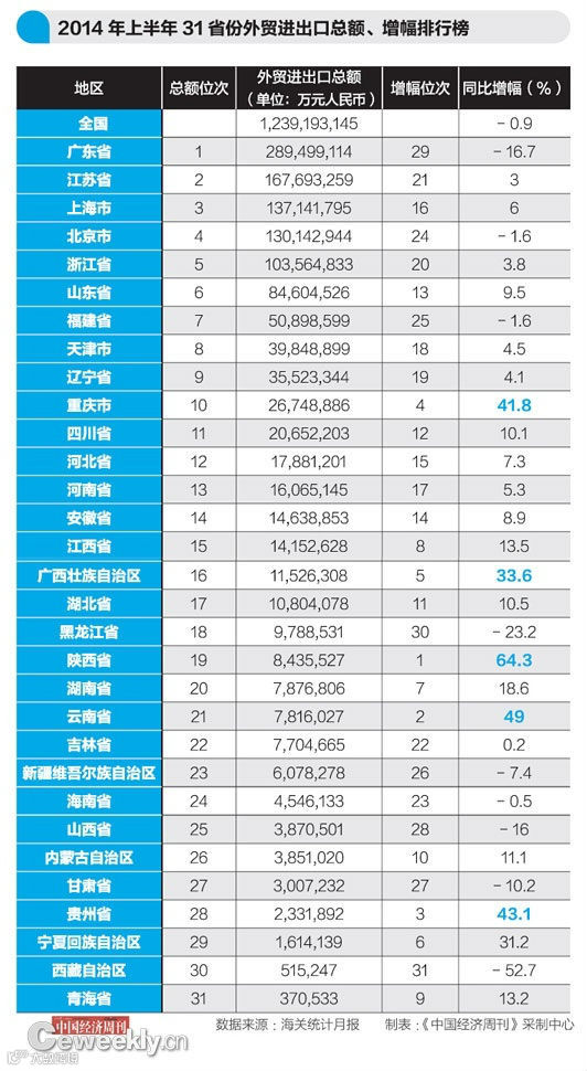 《中国经济周刊》对2014年上半年31省份进出口统计数据进行了分类梳理。