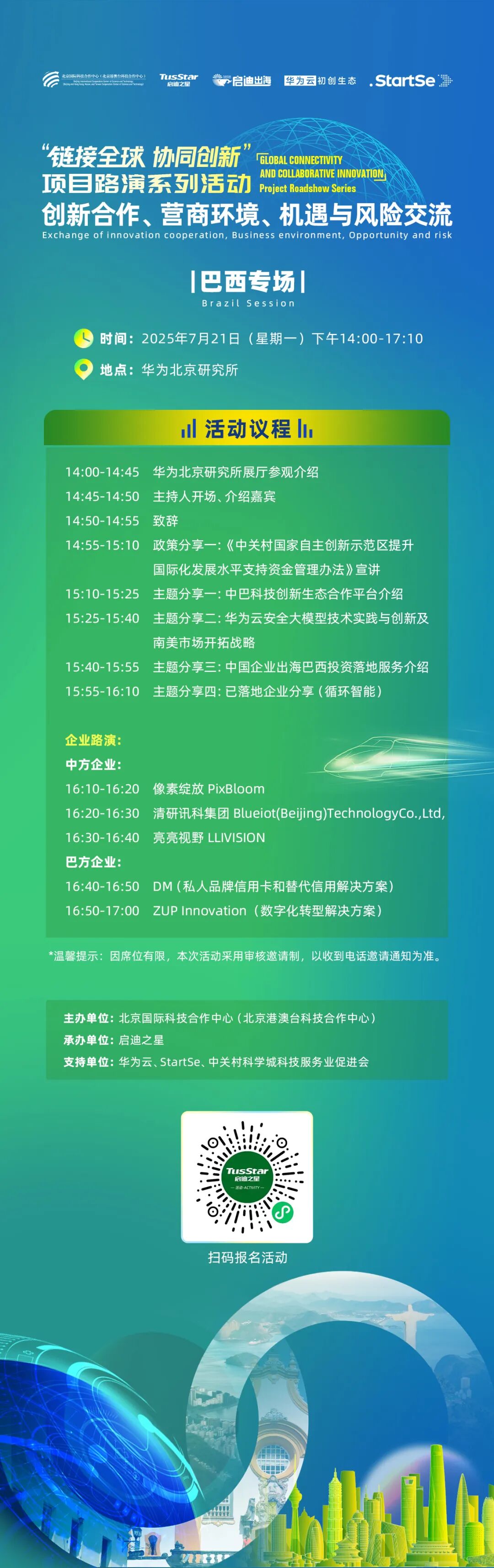 “链接全球 协同创新”项目路演系列活动第二场重磅聚焦南美洲。通过深度解读政策,分享前沿科技主题,与近40位中巴企业家面对面交流,我们将带你深入洞察巴西科技合作需求、市场潜力与投资环境,为你加速国际化进程、助你提升国际竞争力,共同为“一带一路” 高质量发展与北京国际科技创新中心建设添砖加瓦。