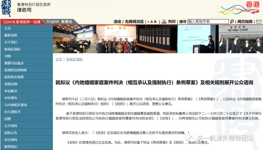 2019年2月,香港特别行政区律政司公布了《内地婚姻家庭案件判决(相互承认及强制执行)条例草案》(以下称“《条例草案》”)和《内地婚姻家庭案件判决(相互承认及强制执行)规则》(以下称“《规则》”)的草案,并宣布自2月8日起至3月8日期间展开公众咨询,搜集公众意见。自2017年与最高人民法院签署《关于内地与香港特别行政区法院相互认可和执行婚姻家庭民事案件判决的安排》后,特区政府开始在香港着手建立两地婚姻家庭民事案件判决相互认可和执行的机制。