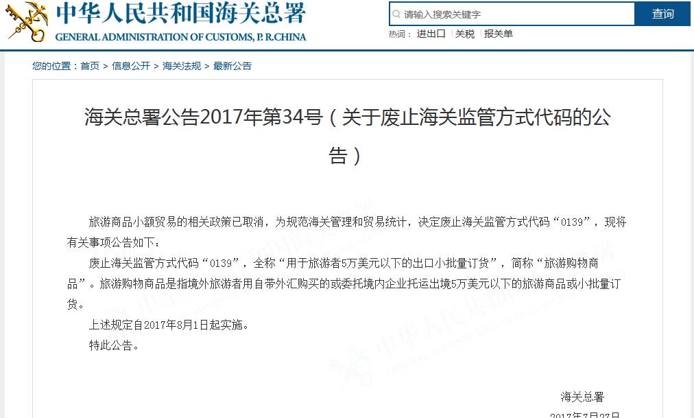海关总署2017年第34公告指出,旅游商品小额贸易相关政策已取消,为规范海关管理和贸易统计,自8月1日起,废止海关监管方式代码“0139”,全称“用于旅游者5万美元以下的出口小批量订货”,简称“旅游购物商品”。