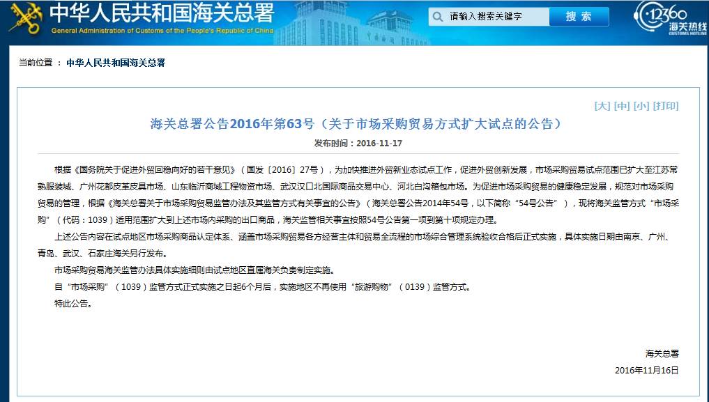 另,根据海关总署公告2016年第63号(关于市场采购贸易方式扩大试点的公告),将海关监管方式“市场采购”(代码:1039)适用范围扩大到江苏常熟服装城、广州花都皮革皮具市场、山东临沂商城工程物资市场、武汉汉口北国际商品交易中心、河北白沟箱包市场内采购的出口商品。