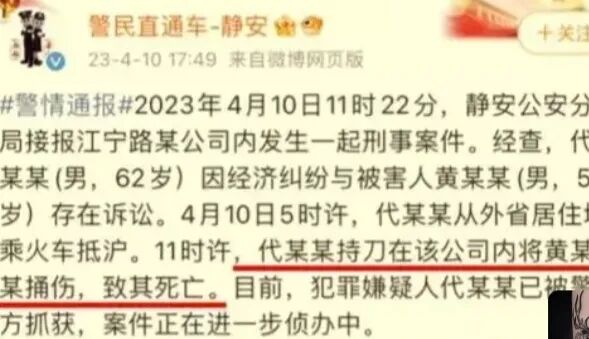 刚刚,上海市公安局静安分局通报了一起刑事案件,男子因经济纠纷从外省来沪,持刀捅伤被害人致其死亡。目前,犯罪嫌疑人代某某已被警方抓获。