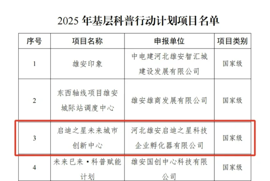 在荣誉与资质方面,启迪之星(雄安)成功获评国家级科普基地,标志着启迪之星助力雄安新区在科技创新与科普融合方面取得新进展。启迪之星(雄安)充分发挥平台优势,整合政府、高校及企业资源,构建了“科普+孵化”特色模式。