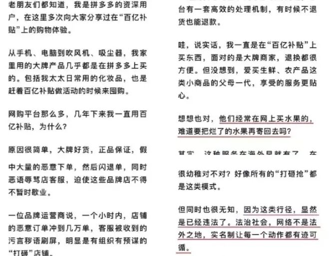 从品牌旗舰店到百亿补贴商家,恶意“炸店”行为一再针对拼多多的品牌体系,其真实意图到底是什么?#仅退款是维护消费者权益#拼多多“仅退款”有明确界定,且经过多次优化和迭代,帮助消费者有效规避了货不对板、恶意欺诈等不良购物体验,是消费者维护自身权益的有利途径。网络并非法外之地,如此恶劣的“炸店“行为罔顾商业道德,平台已固定相关证据,并将坚决诉诸司法机关。