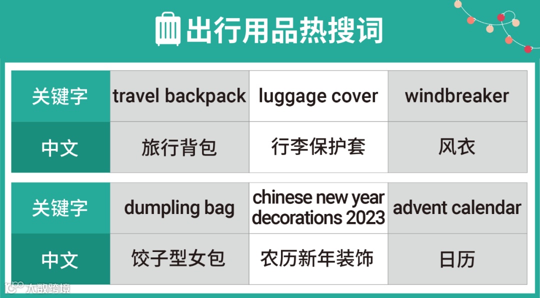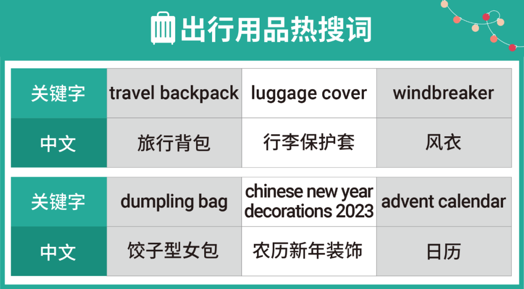 也有一部分新加坡买家将在农历春节出行,或者聚会,所以商家们可以为行李保护套、旅行收纳袋等配件做足准备。