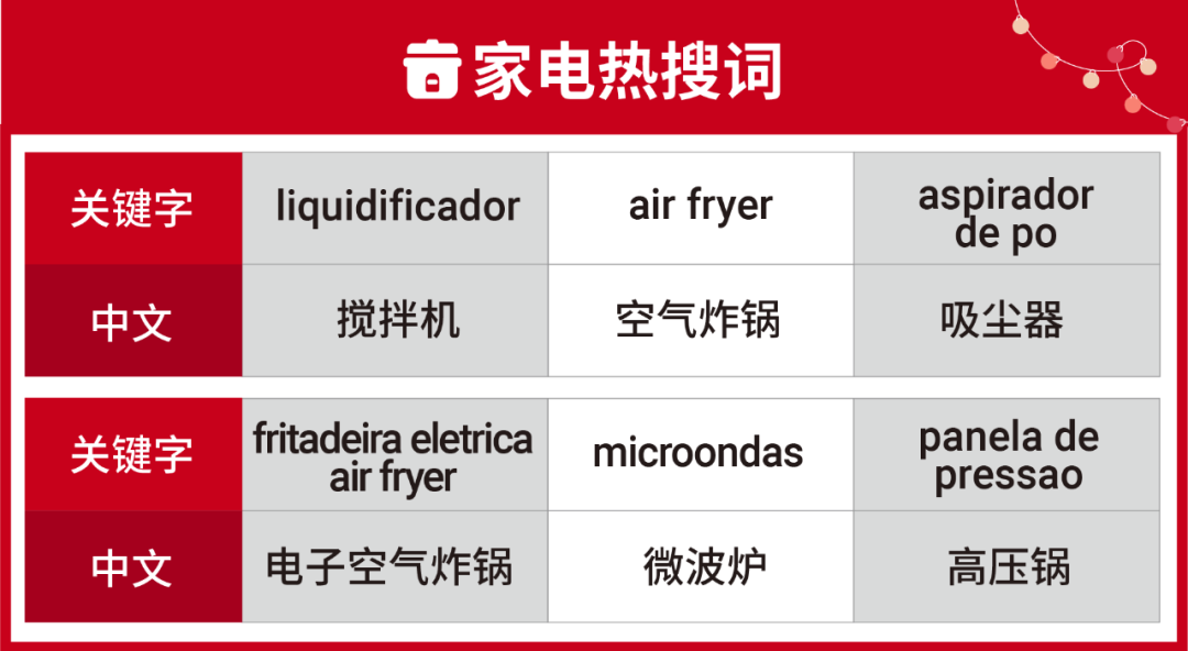 年底清扫迎接新年的传统习惯将刺激扫地机器人、吸尘器等清洁小家电的巴西市场渗透率,总体呈现蓝海市场。建议卖家找准热搜关键词投放广告,提前占领买家心智。