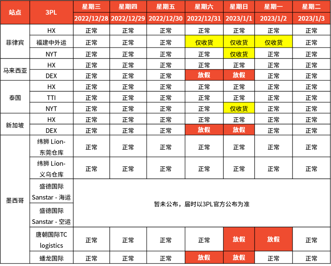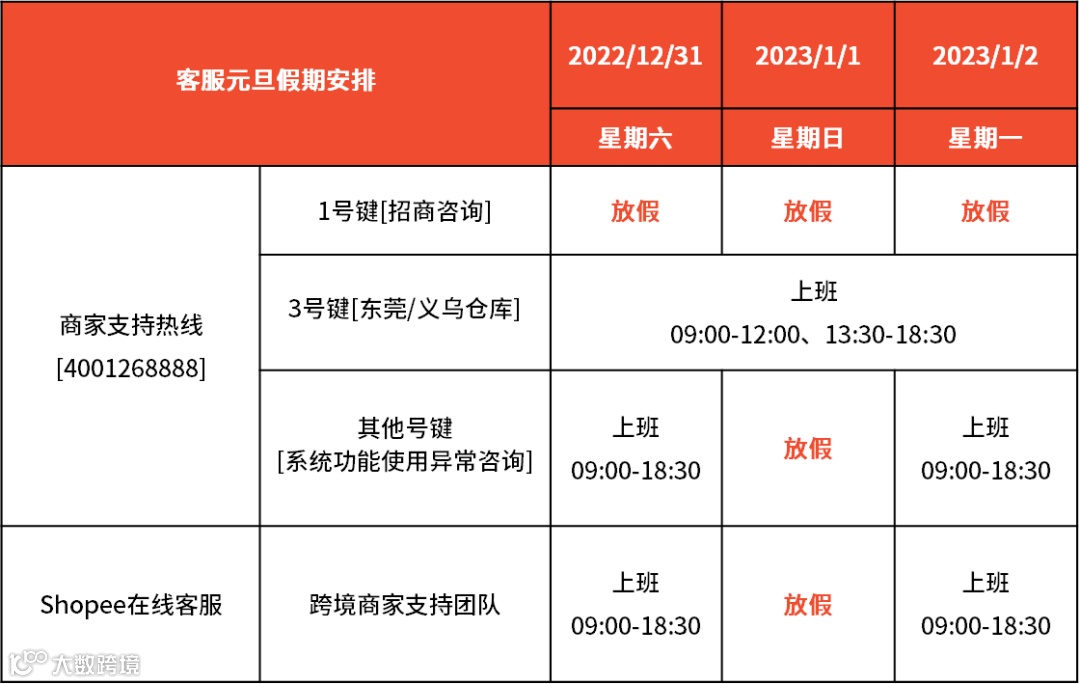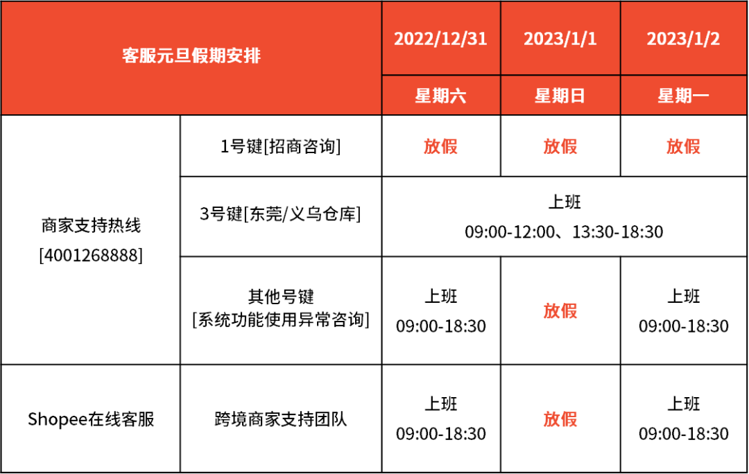 Shopee平台将在元旦节法定假日2022年12月31日至2023年1月2日豁免卖家的物流时效。物流时效豁免只针对DTS设置的工作日,自然日没有物流时效豁免。