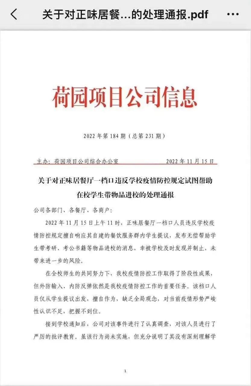 据悉,郑州大学荷园项目公司是郑州大学的高校后勤服务实体。其发布的通报称,虽该档口工作人员的行为尚未实施,但这表明该档口人员没有深刻理解学校疫情封控管理的重要性。鉴于其认错态度诚恳,决定对该档口作出罚款3000元、停业整顿、解散微信群、在全园区通报批评等四项处罚。