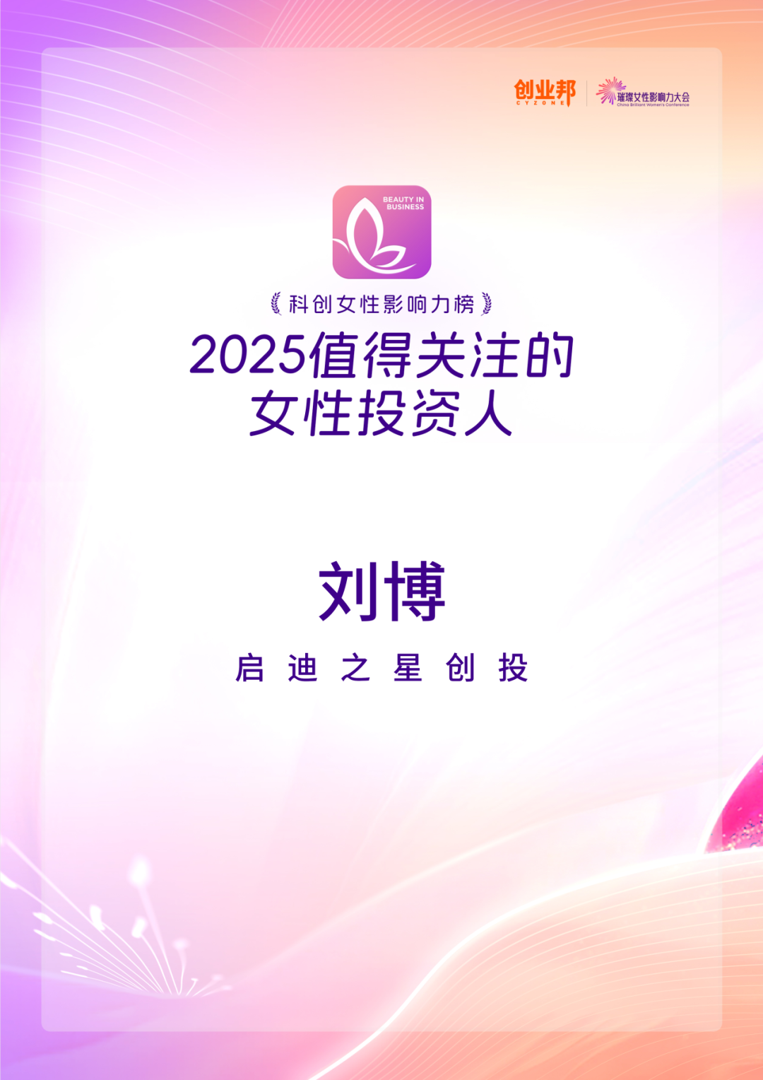 4月17日,由创业邦主办的“2025璀璨女性影响力大会”在京举行。启迪之星创投总经理、主管合伙人刘博受邀出席大会,同时入选创业邦 “2025值得关注的女性投资人”。