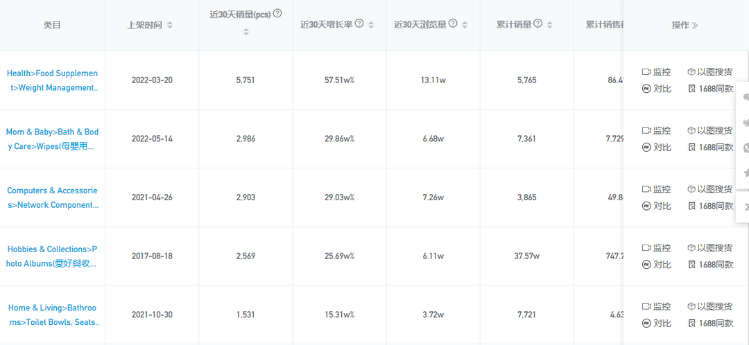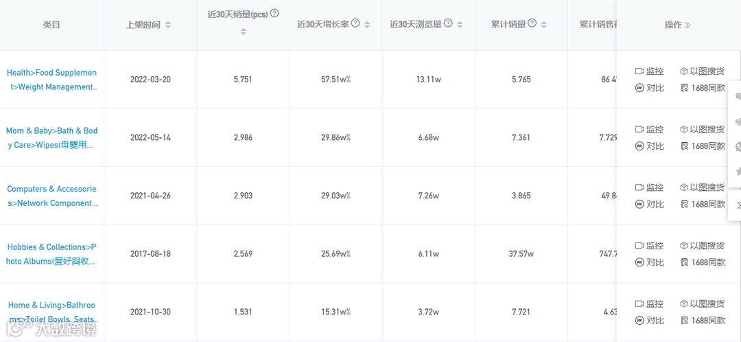 在【电霸数据-选品分析-潜力产品】功能下,数据指标选择“近30日销量增长率”TOP榜,筛选出“近30日销量”中等,“上架时间”较短的产品。