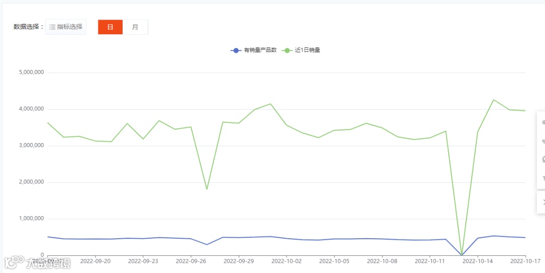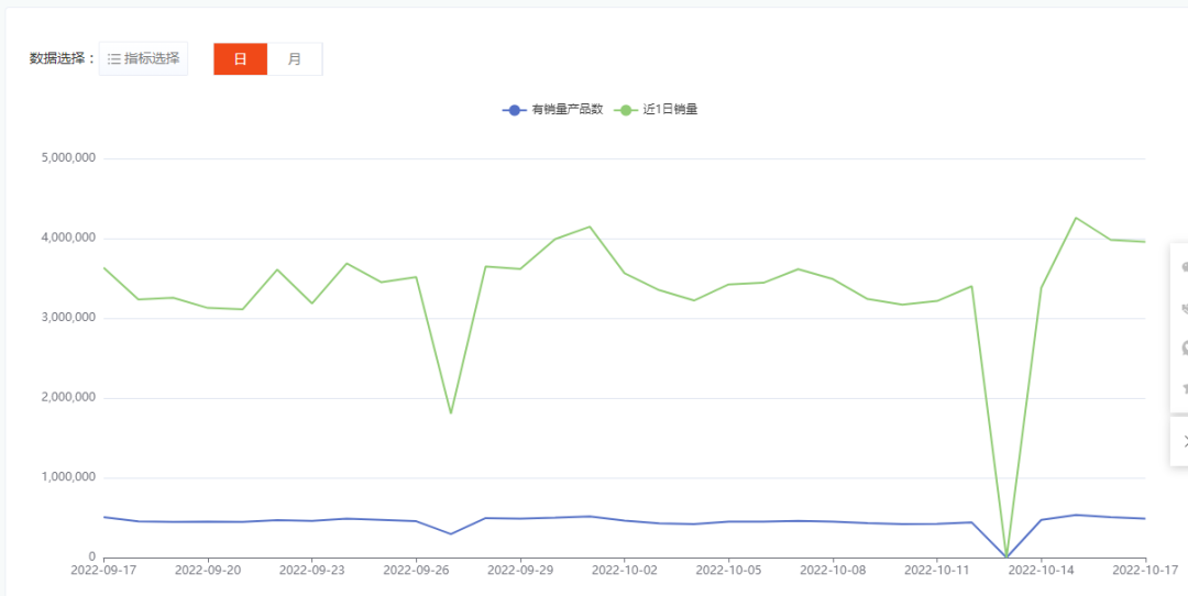 在【电霸数据-大盘数据-行业总览-行业分布】功能下,选择“近30天销量分布”,有销量产品占比越大,说明市场机会越大,能快速找出潜力市场。