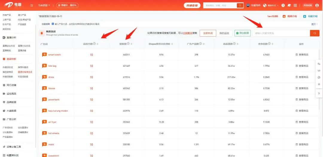 打开电霸数据分析软件Shopee版官网-选词分析-直通车精准选词,在右侧输入大词(比如女装),获取各类直通车精准选词的搜索量及品质分数。精选出来的词用作大促期间使用关键词广告能让店铺粉丝增长、单品销量翻升,是卖家打造爆款产品,并为店铺带来大促后长线盈利的绝佳机会!