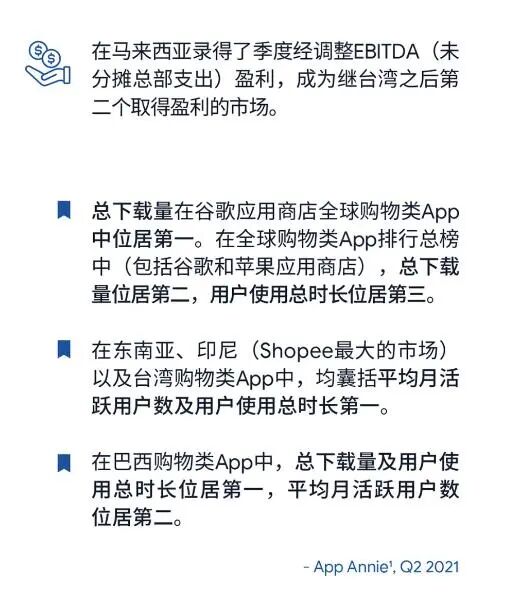 在对比21年Q2季度(下图)来看,22年在谷歌应用商店全球购物类App中,Shopee用户使用总时长位居第一,平均月活跃用户数位居第二。在东南亚、印尼、台湾及巴西市场的购物类App中,Shopee平均月活跃用户数及用户使用总时长均位列第一。Shopee已经覆盖了东南亚市场,成为了东南亚地区“电霸大厂”。