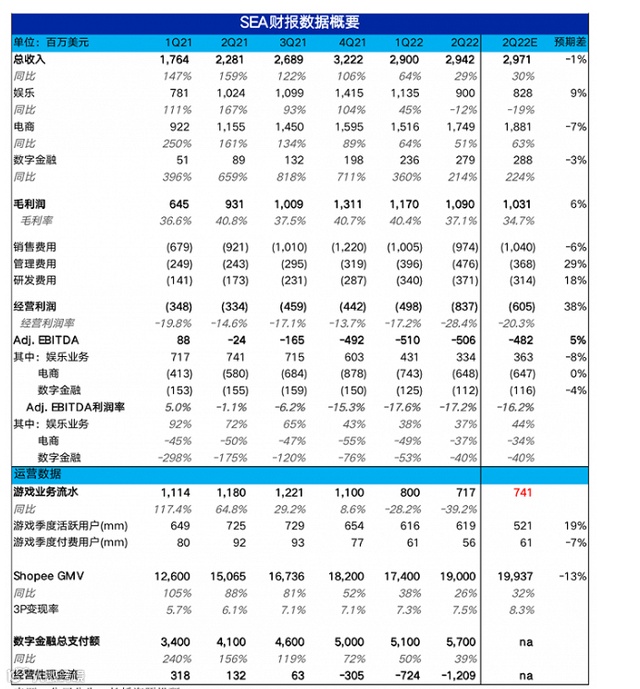 由于美元升值、全世界范围内的通胀、和线下消费复苏的共同冲击,本季Shopee GMV增速再度下滑至26%,总量为190亿元,低于市场下调预期后的199亿,可见公司主动把战略重心由规模转向利润后对增长的拖累不小。好在Shopee通过在东南亚等核心市场提升变现率的举措(环比增长20基点到7.5%),帮助营收仍实现了51%的增长到17.5亿美元,低于市场过于乐观预期的18.8亿,但相对应的Sea肯定会在接下来格外关注Shopee发展走向。