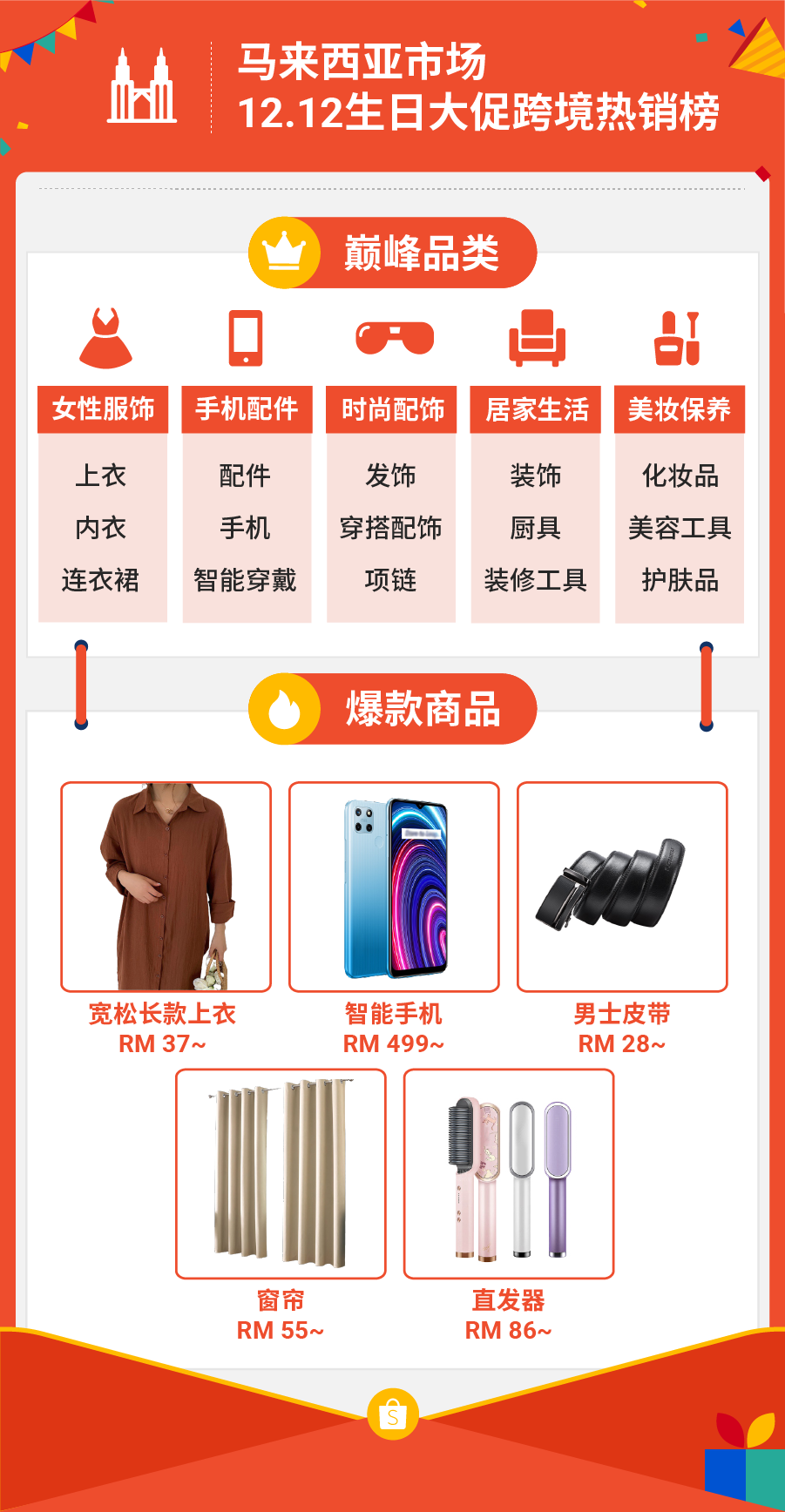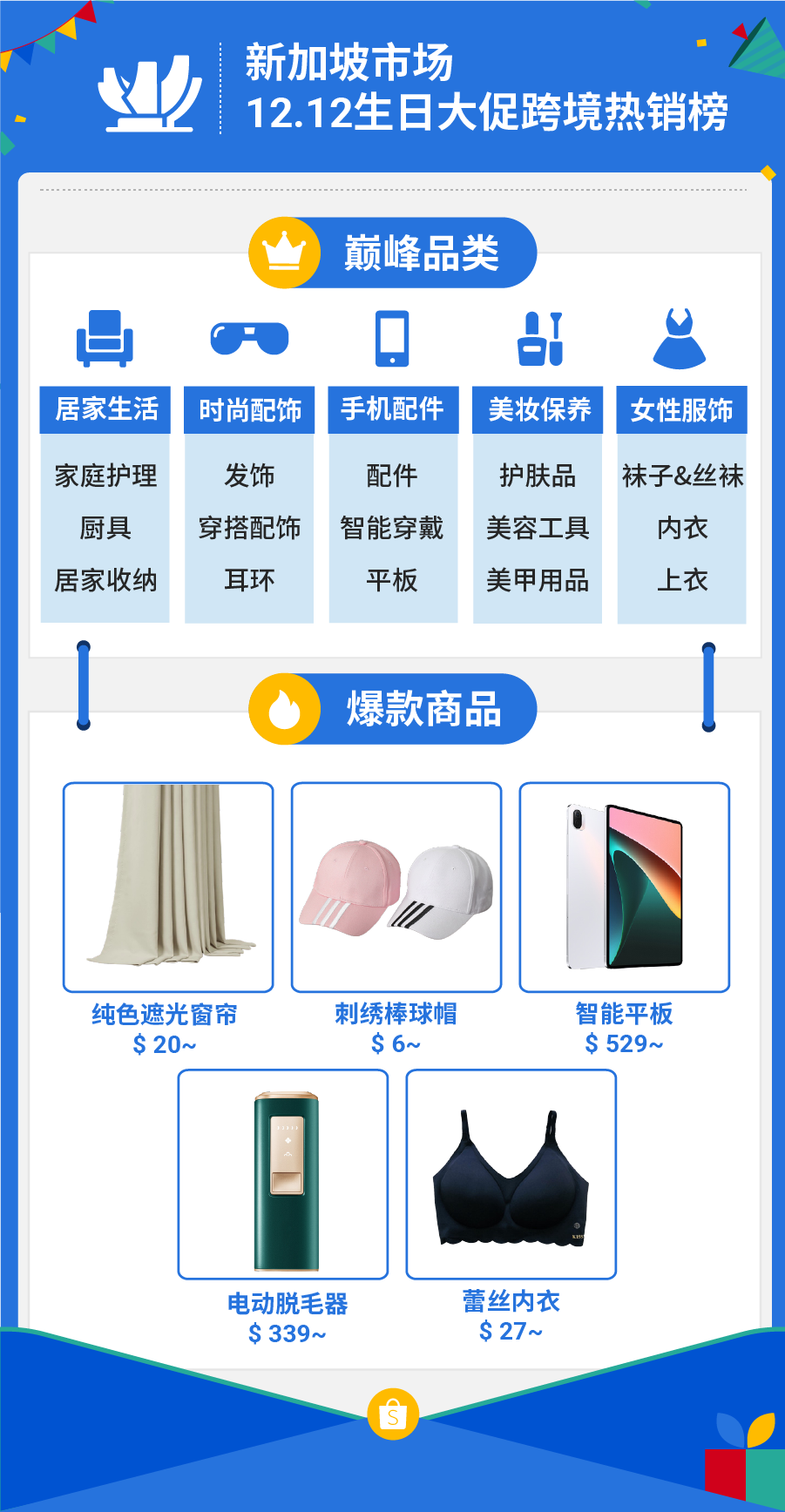 今年12.12大促中,缤纷多样的国货极大丰富了东南亚消费者的节庆选择,时尚配饰、居家生活、3C电子及美妆保养成为最受欢迎的跨境品类。在Shopee跨境的支持下,更多中国卖家得以灵活高效地填补海外市场需求,借势实现增长:据统计,首次参与12.12大促的跨境新卖家大促首2小时单量已达平日全天3倍。