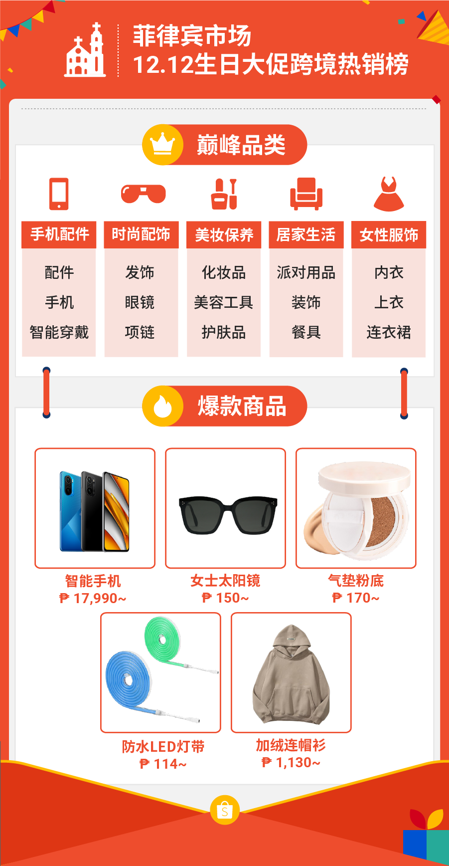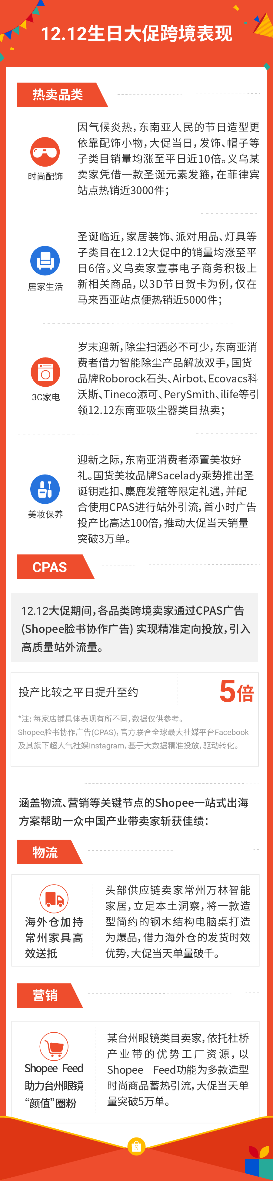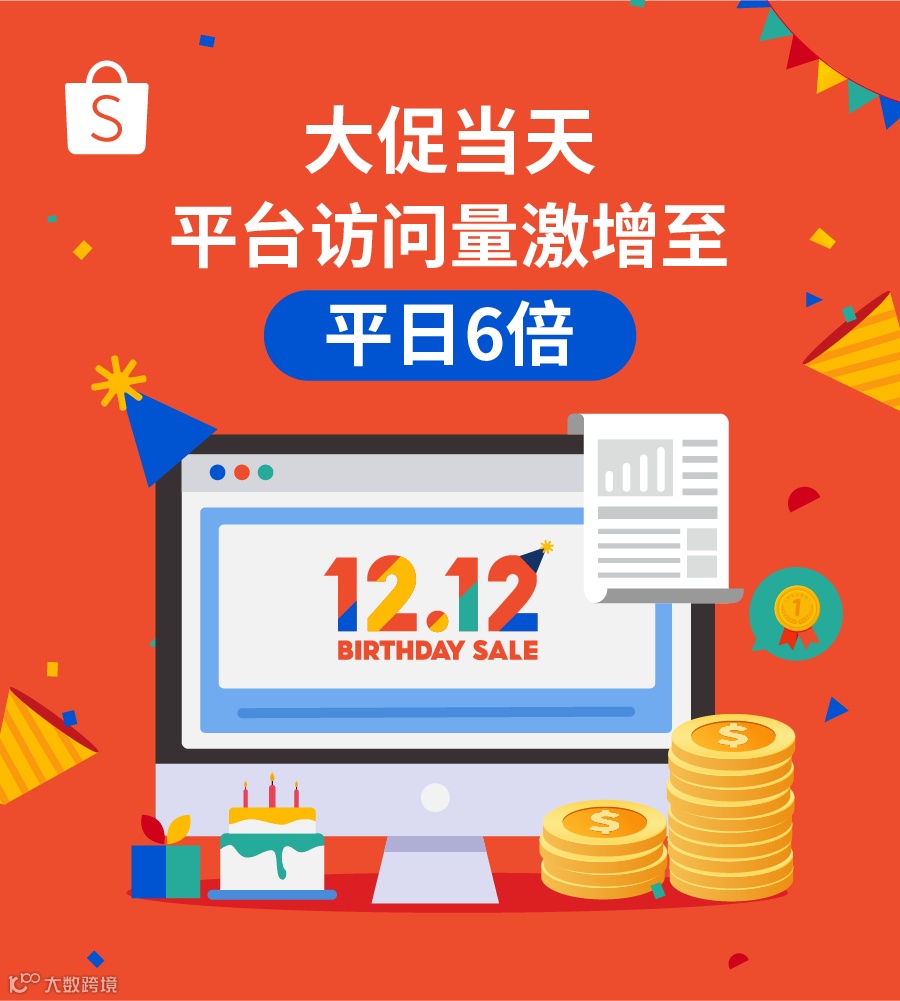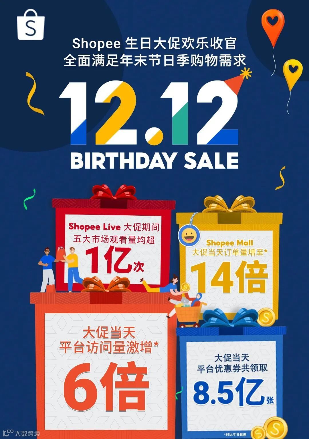 2021 年 12 月 14 日,电商平台 Shopee 宣布,年终欢乐庆典12.12生日大促圆满落幕:大促当天,平台访问量激增至平日6倍,超8.5亿张平台优惠券被东南亚消费者们收入囊中,时尚配饰、居家生活、3C电子及美妆保养为广受欢迎的跨境品类。