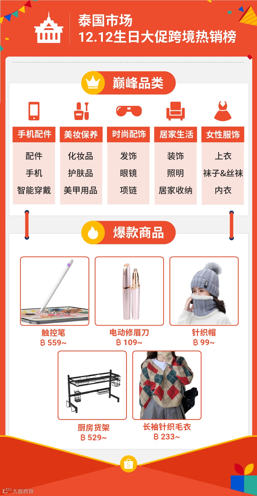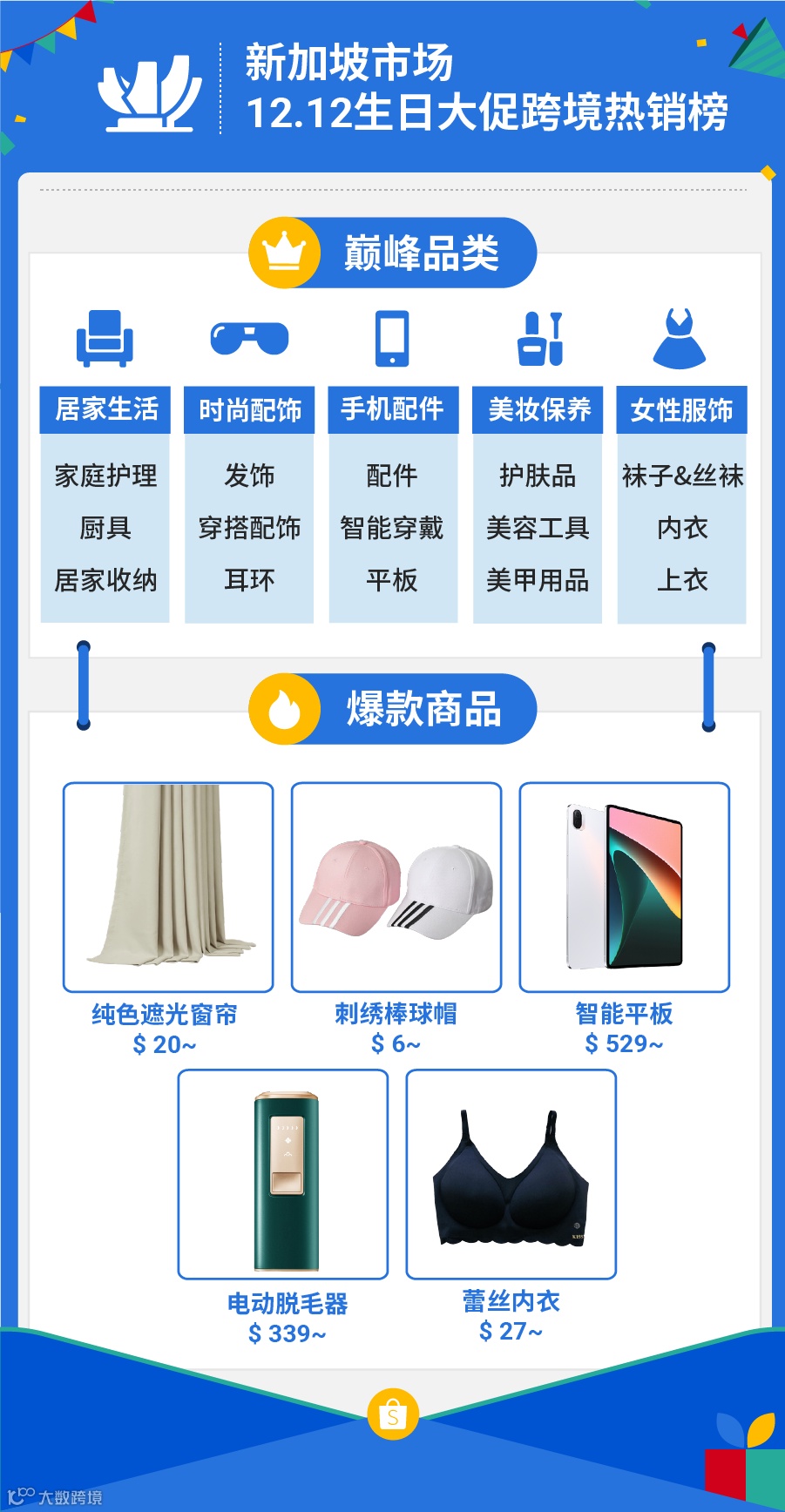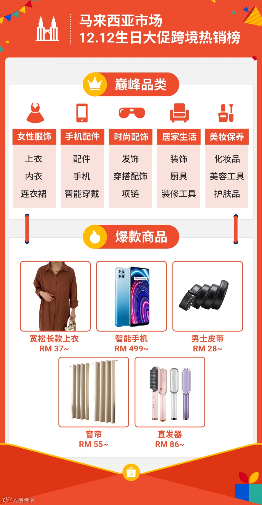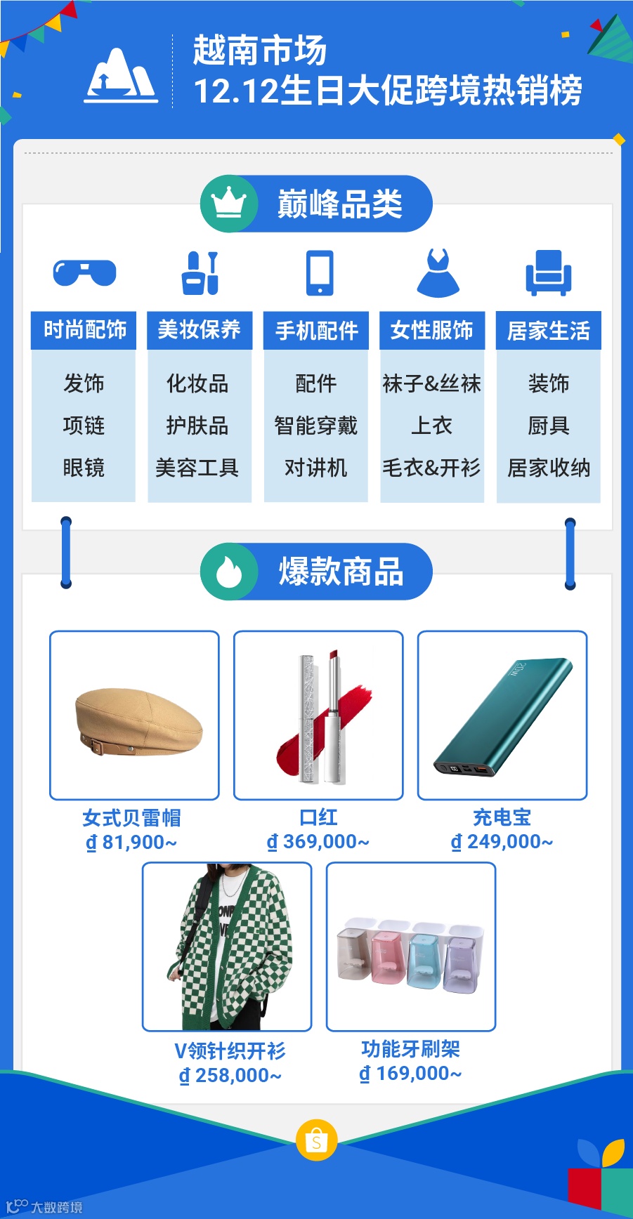 2021 年 12 月 14 日,电商平台 Shopee 宣布,年终欢乐庆典12.12生日大促圆满落幕:大促当天,平台访问量激增至平日6倍,超8.5亿张平台优惠券被东南亚消费者们收入囊中,时尚配饰、居家生活、3C电子及美妆保养为广受欢迎的跨境品类。